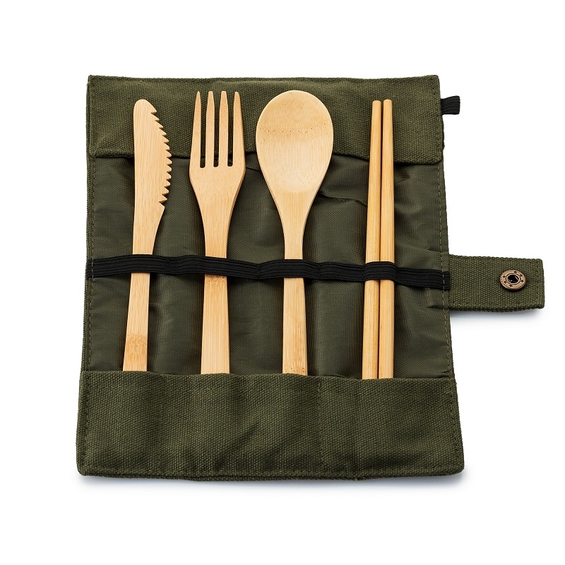 В наборе: нож, ложка, вилка, палочки для еды. Также есть два свободных места, например, для многоразовой трубочки, ёршика или зубной щётки.