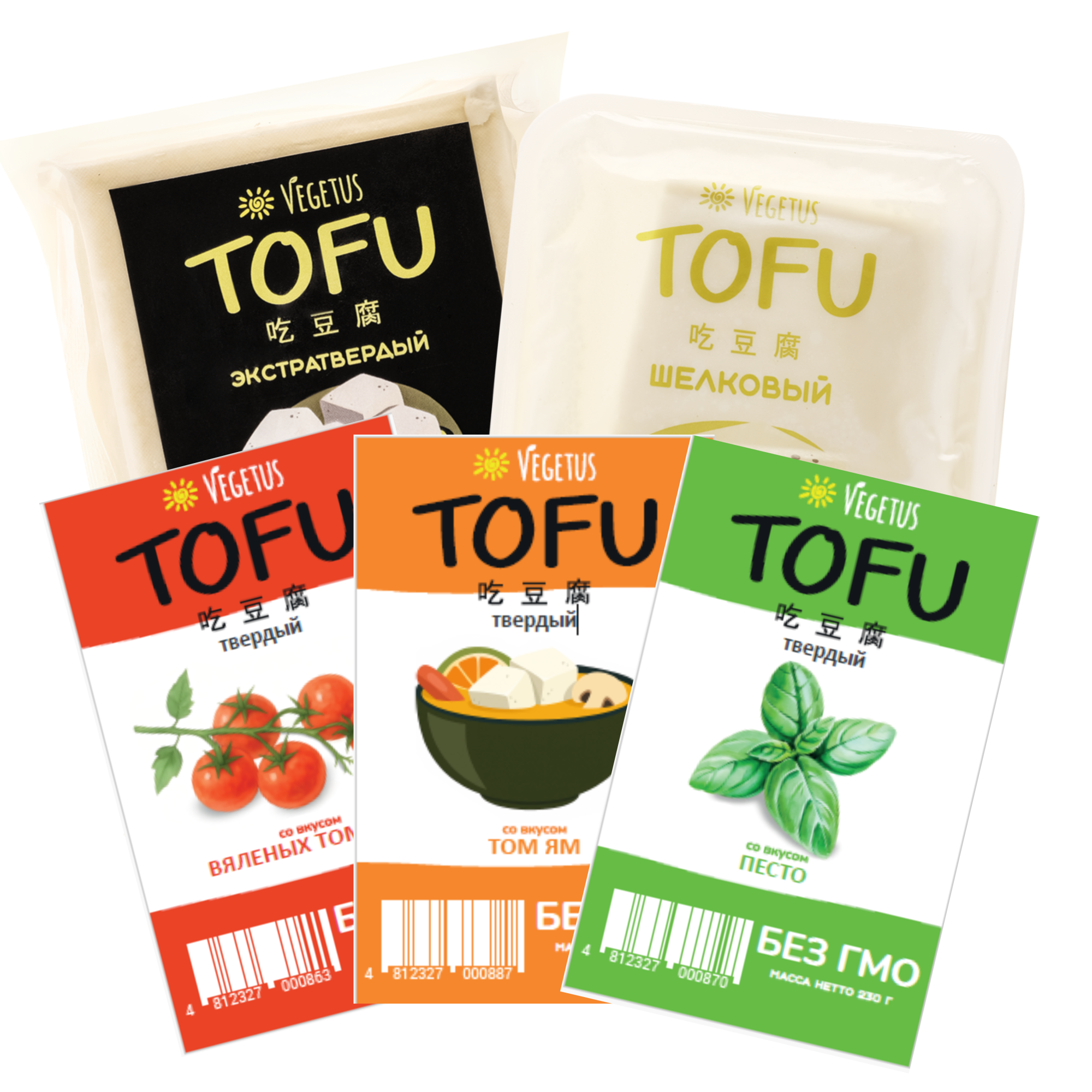 Набор тофу Vegetus. В набор входят 5 видов тофу: тофу экстратвердый, тофу шелковый, тофу со вкусом «Том Ям», тофу со вкусом «Песто», тофу со вкусом вяленых томатов Vegetus.